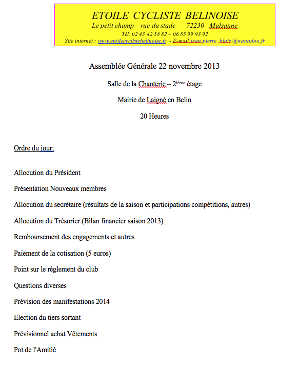 Le 22/11/2013 Assemblée générale ECB vendredi 22 novembre 2013 à 20 HeuresSalle de la Chanterie – 2ème étageMairie de Laigné en Belin